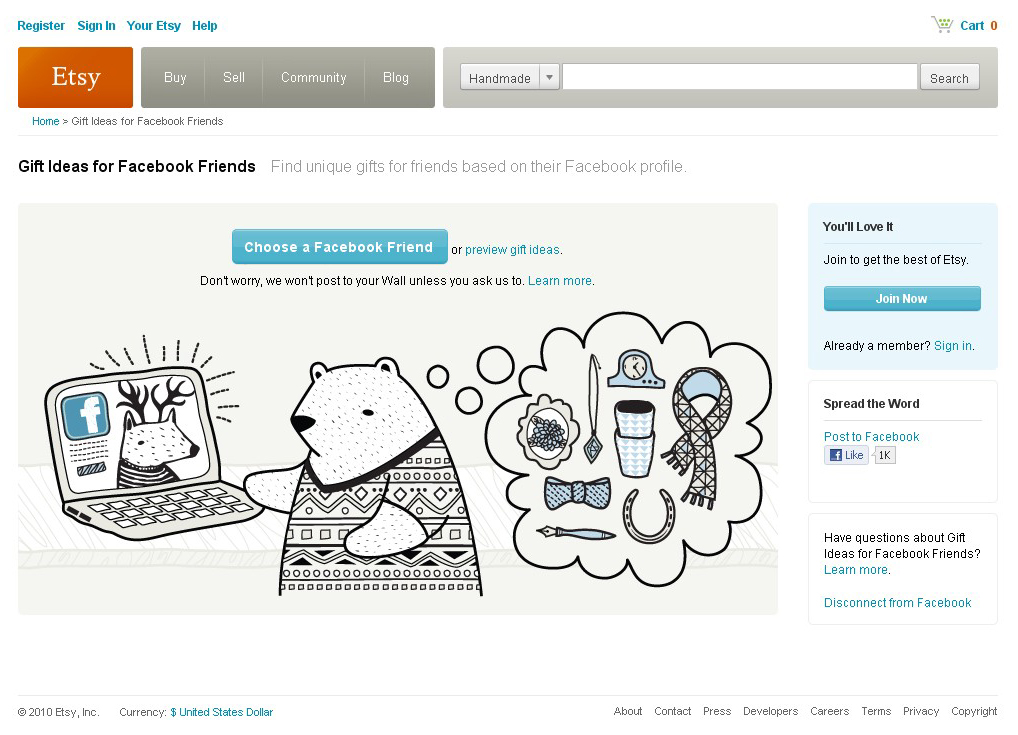 So last week I told you how you can get your last minute shopping done with Etsy's Shop Local feature. Today we will look at the Shop Etsy with Facebook tool. It gives you some interesting insights into your friends and family. To find this go to: Etsy -- Buy -- Find Gifts, or go directly to etsy.com/gifts. You'll see this page: